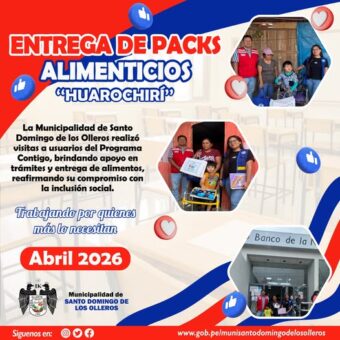 La Municipalidad Distrital de Santo Domingo de los Olleros realizó la entrega de packs alimenticios a usuarios del Programa Contigo, brindando apoyo social y atención directa a familias del distrito.