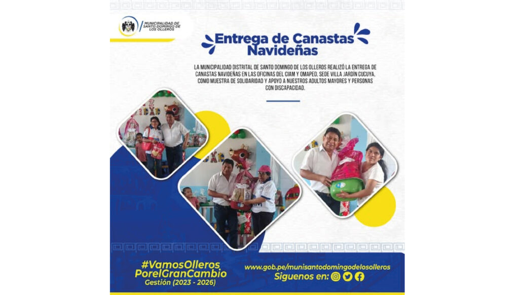 La Municipalidad Distrital de Santo Domingo de los Olleros realizó la entrega de canastas navideñas en las oficinas del CIAM Y OMAPED, sede Villa Jardin Cucuya, como muestra de…