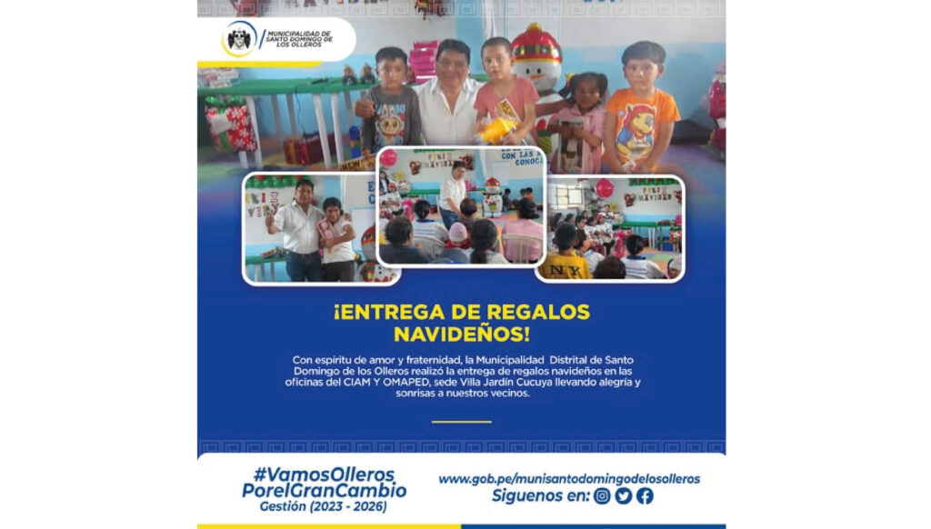 Con espíritu de amor y fraternidad, la Municipalidad Distrital de Santo Domingo de los Olleros realizó la entrega de regalos navideños en las oficinas del CIAM y OMAPED, sede…