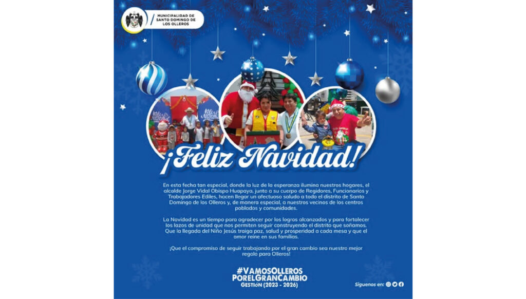 Que el espíritu de la Navidad llene sus corazones de alegría y sus hogares de bendiciones. Nuestro alcalde, Jorge Vidal Obispo Huapaya, los regidores y todo el equipo humano…