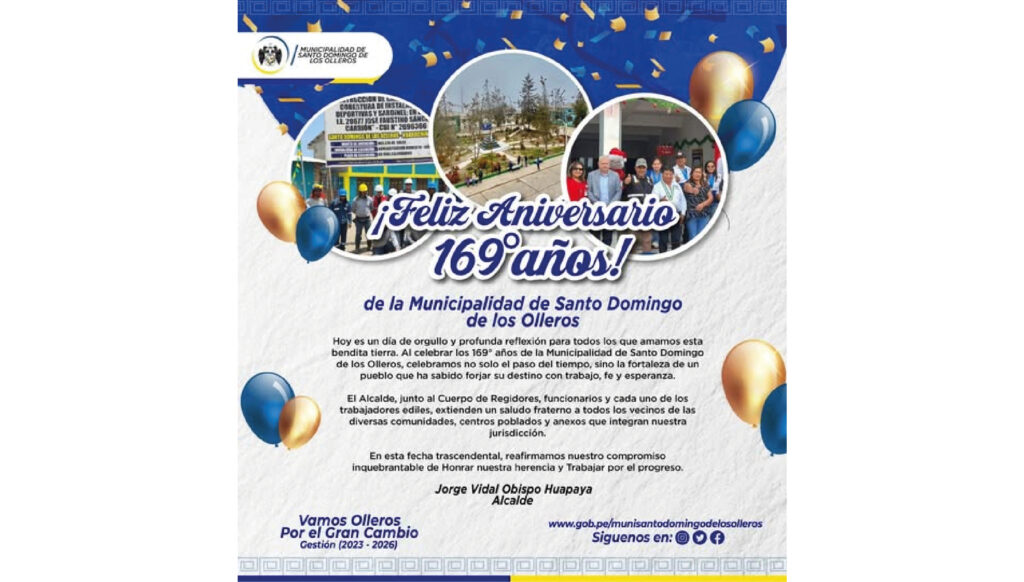 ?Hoy nos vestimos de gala para celebrar el aniversario de nuestra querida Municipalidad de Santo Domingo de los Olleros. Son 169 años forjando nuestro destino con la fuerza de…
