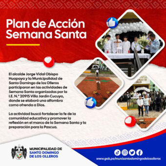 El alcalde Jorge Vidal Obispo Huapaya junto al equipo de la Municipalidad de Santo Domingo de los Olleros participaron en las actividades de Semana Santa organizadas por la I.E. N.° 20915 Villa Jardín Cucuya – Pucará, elaborando una alfombra como ofrenda a Dios.