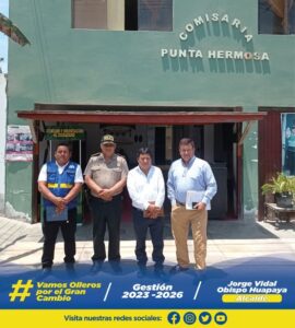 En la comisaría de Punta Hermosa, el lunes 03 de marzo, el alcalde de Santo Domingo de Los Olleros Jorge Obispo Huapaya, acompañado por el Subgerente de Seguridad Ciudadana William Alanya, fueron coordialmente recibidos por el Mayor PNP Miguel Ángel Ríos Santos (Comisario de Punta Hermosa), y sostuvieron una reunión previa a la inspección a realizarse en el predio del Centro Poblado de Santa Rosa, para llevar a cabo, la creación de una comisaría; del mismo modo y aprovechando la presencia del burgomaestre, se realizaron coordinaciones para unir esfuerzos que garanticen el orden y la seguridad en el distrito.